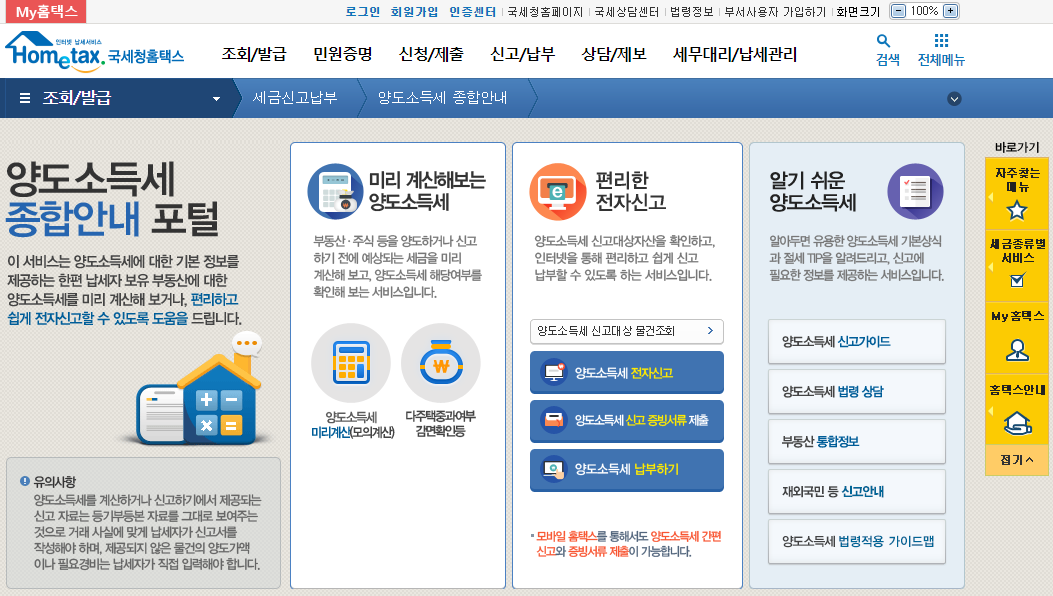 신고서 및 납부서를 준비해야 한다. 이 사항에 대해서는 홈택스 사이트에서 양도소득세 메뉴에 들어가게 되면 양도세를 신고할 때 필요한 서류 서식 등을 다운로드하는 것이 가능하다.