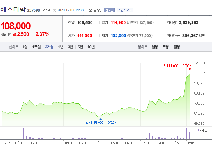 2일 전 에스티팜이 가격 제한폭까지 상승하면서 굉장한 이슈가 되었었다.