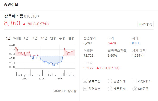 (12월 15일 종가 8,360원을 기준으로 할 때)