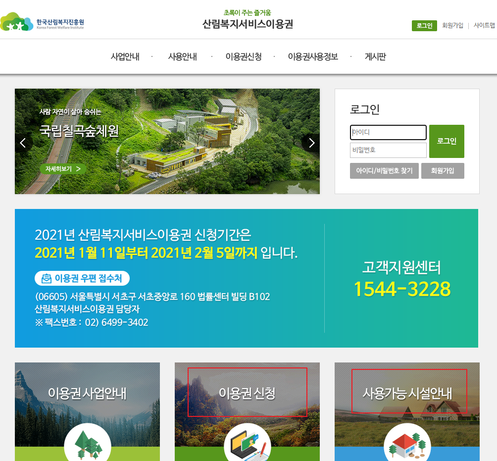 산림복지서비스 이용권 관련 신청문의는 산림복지서비스이용권 고객지원센터 1544-3228로 전화하면 된다.