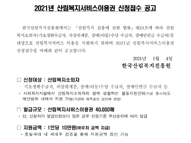 - 1인당 10만원 지원받는 산림복지서비스이용권 신청 바로가기 목차