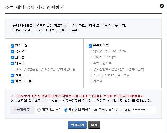 위의 사진처럼 공제항목을 모두 확인한 후에 '인쇄하기' 혹은 '내려받기'를 통해서 자료를 수집 후 제출해주면 완료된다.