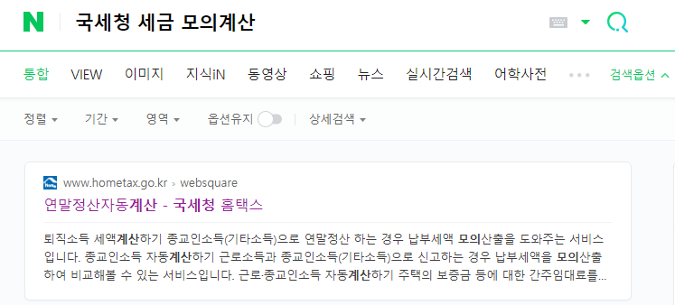 아마 검색을 하고 나면 가장 위 쪽에 <연말정산자동계산 - 국세청 홈택스>라는 것이 보일 것이다.