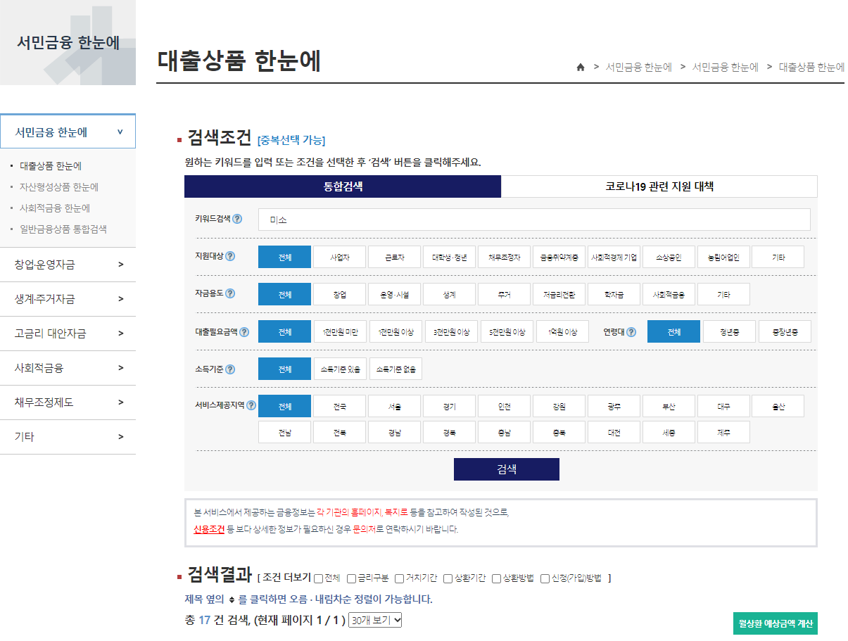 대출상품 한 눈에를 들어가서 미소금융 혹은 미소 로 검색을 하게 되면 여러가지 정보들이 나오게 된다.