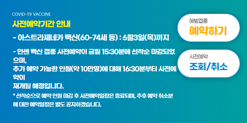 얀센 백신의 대상자가 아마 가장 궁금할 것이다. 코로나 예방 접종 예약 사이트를 이용해야하며, 6월 11일까지만 예약을 받는다고 한다.